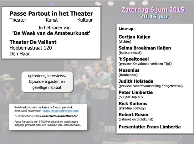 In het kader van 'De Week van de Amateurkunst' maakt Frans Limbertie op zaterdag 6 juni a.s. een editie van zijn programma 'Passe Partout in het Theater'. Passe Partout in het Theater is een gevarieerd en gezellig theaterprogramma met diverse gasten uit de wereld van kunst en cultuur. Plaats van handeling is Theater de Vaillant aan de Hobbemastraat 120 in de Haagse Schilderswijk. Aanvang is 20.15 uur en toegangsprijs is 1 euro. Kaarten a/d kassa van Theater De Vaillant. Evt. reserveren: frans.limbertie@yahoo.com Line-up: Gertjan Kajen (dichter en tekenaar) Selma Broekman (buikspreekact) 't Speeltoneel (preview nieuwste voorstelling) Rick Kuitems (standup comedy) Judith Hofstede (preview cabaretvoorstelling Fringefestival) Musonius (troubador en finalist DNR Open Podia)